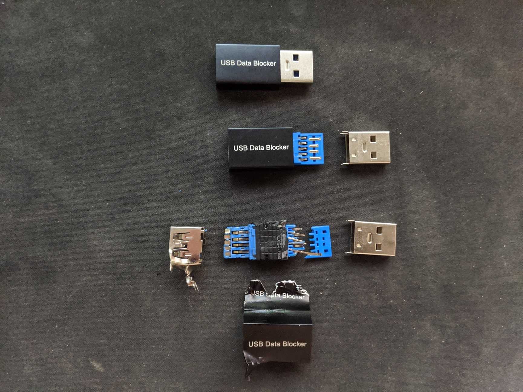 Connecting the data blocker dongle with my device to the motherboard works fine. However when I connected it to my Dell U2715H monitor, the USB hub would reset. The data blocker dongle doesn't play nice with the monitor's USB hub so I decided to take one apart to find out why. In hindsight... I could have done this with my multimeter but hey. Destroying things I just bought is way more fun.